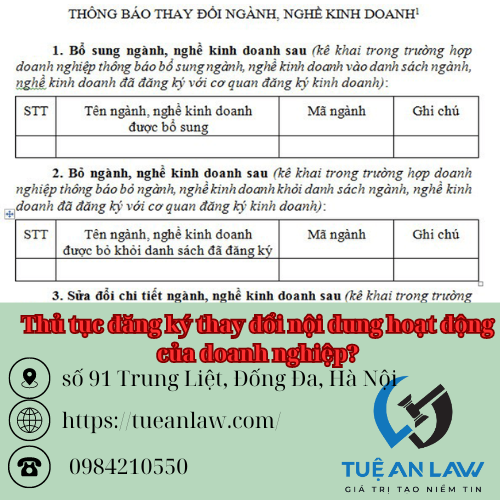 Trên đây là tư vấn của Tuệ An LAW về: “Thủ tục đăng ký thay đổi nội dung hoạt động của doanh nghiệp?” theo quy định pháp luật mới nhất. Nếu còn vướng mắc, chưa rõ hoặc cần hỗ trợ pháp lý vui lòng liên hệ hotline 098.421.0550 để được tư vấn và hỗ trợ.
