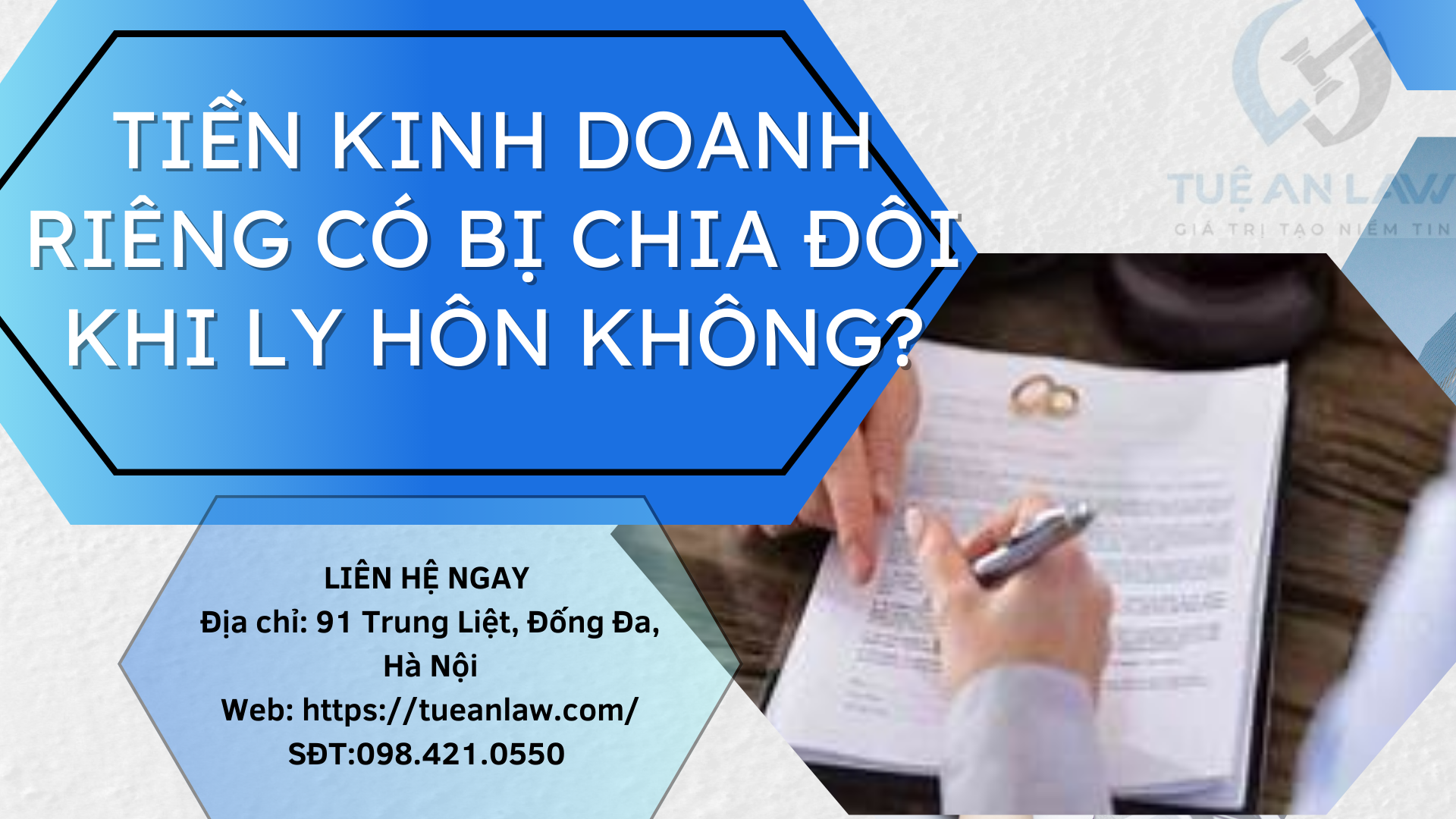Nếu bạn cần giải đáp thắc mắc “Tiền kinh doanh riêng có bị chia đôi khi ly hôn không?” Hãy xem một số bài viết của chúng tôi hoặc bạn có thể liên hệ đến Tuệ An Law theo các phương thức sau: