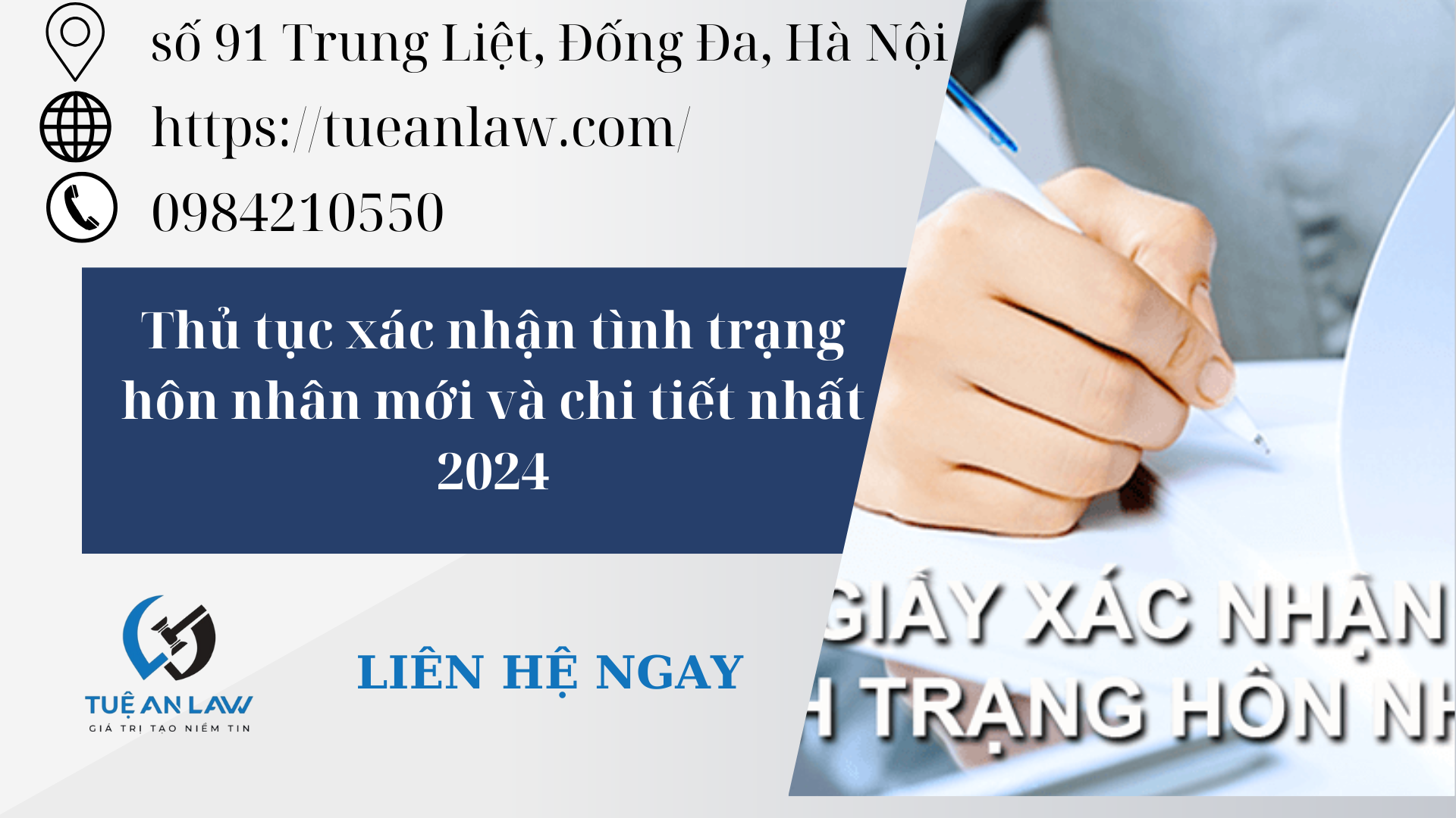 Trên đây là toàn bộ tư vấn của Tuệ An Law về “thủ tục xác nhận tình trạng hôn nhân”. Nếu quý khách có bất kỳ thắc mắc và các vấn đề cần giải đáp xin hãy liên hệ với chúng tôi qua số điện thoại/zalo Tel: 094.821.0550