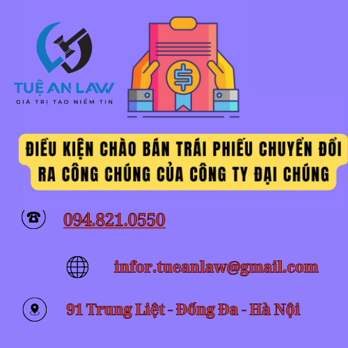 Trên đây là toàn bộ tư vấn của Tuệ An Law về “Điều kiện, hồ sơ chào bán trái phiếu chuyển đổi, trái phiếu kèm chứng quyền ra công chúng của công ty đại chúng”. Nếu quý khách có bất kỳ thắc mắc và các vấn đề cần giải đáp xin hãy liên hệ với chúng tôi qua số điện thoại/zalo Tel: 094.821.0550