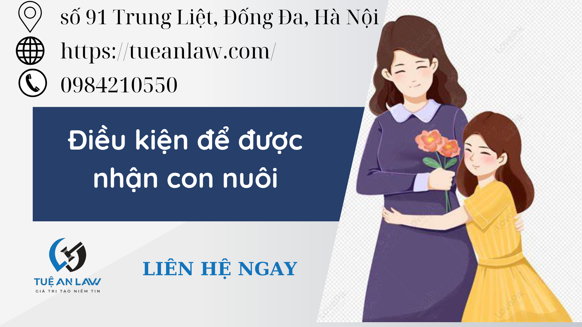 Trên đây là toàn bộ tư vấn của Tuệ An Law về “Điều kiện để được nhận con nuôi”. Nếu quý khách có bất kỳ thắc mắc và các vấn đề cần giải đáp xin hãy liên hệ với chúng tôi qua số điện thoại/zalo Tel: 094.821.0550 hoặc tham khảo bài viết sau: Hồ sơ nhận nuôi con nuôi