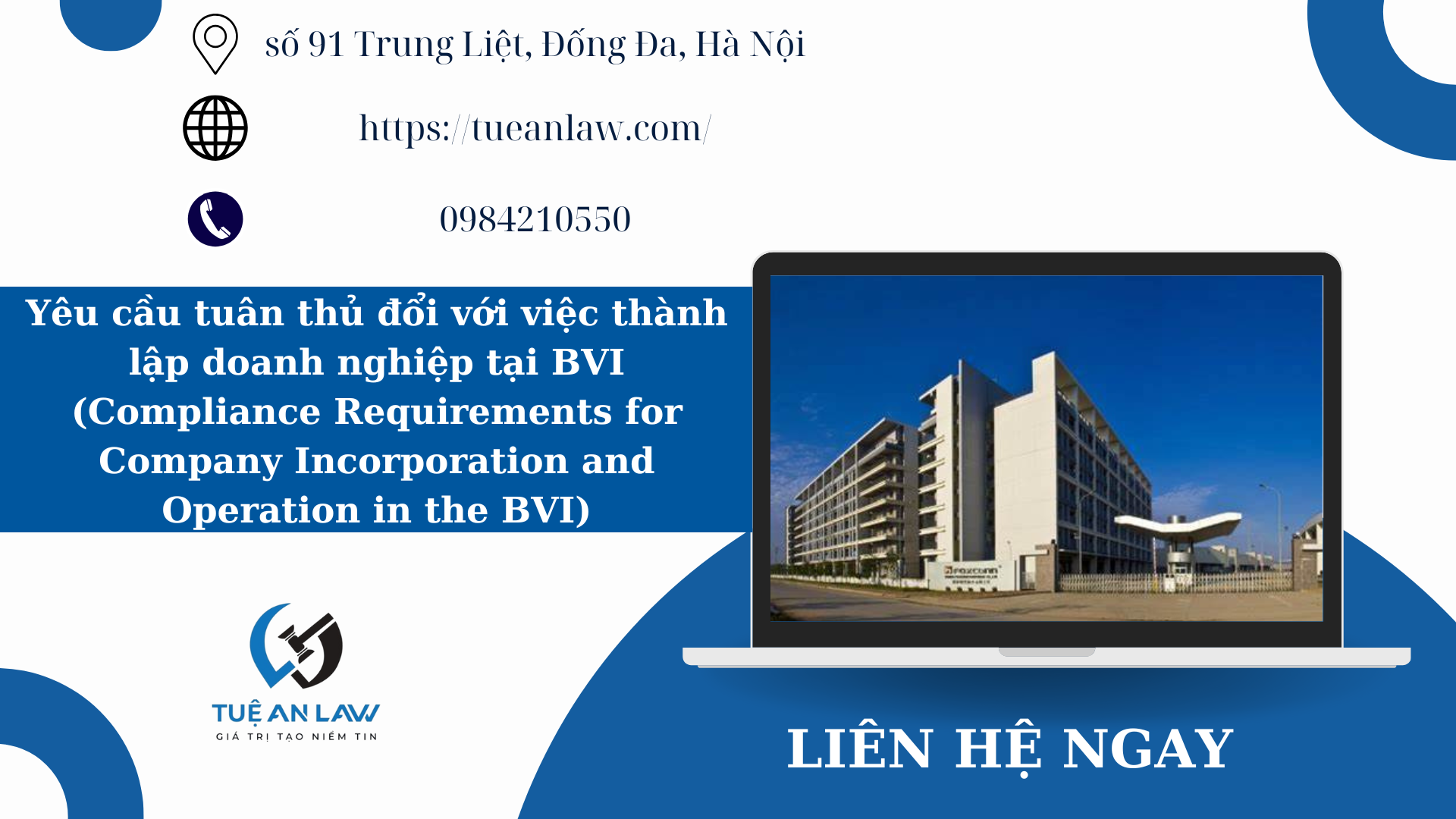 Trên đây là toàn bộ tư vấn của Tuệ An Law về “Yêu cầu tuân thủ đổi với việc thành lập doanh nghiệp tại BVI”. Nếu quý khách có bất kỳ thắc mắc và các vấn đề cần giải đáp xin hãy liên hệ với chúng tôi qua số điện thoại/zalo Tel: 098.421.0550