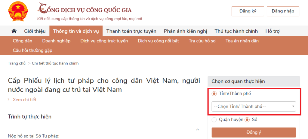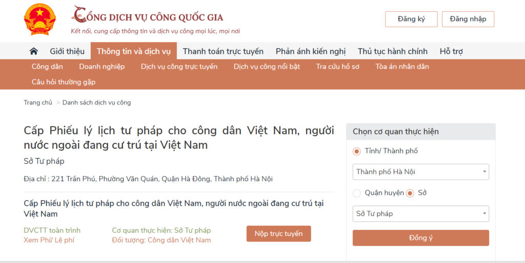 Tiếp theo, tìm đường dẫn đến phần “Lý lịch tư pháp” hoặc “Công dân văn phòng tư pháp“. Như Cổng dịch vụ công quốc gia.