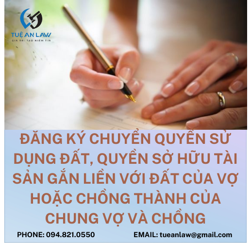 Trên đây là tư vấn của Tuệ An LAW về: “Đăng ký chuyển quyền sử dụng đất, quyền sở hữu tài sản gắn liền với đất của vợ hoặc chồng thành của chung vợ và chồng“ theo quy định pháp luật mới nhất. Nếu còn vướng mắc, chưa rõ hoặc cần hồ trợ pháp lý khác; vui lòng liên hệ ngay Luật sư để được tư vấn miễn phí. Luật sư chuyên nghiệp, tư vấn miễn phí – 098.421.0550.